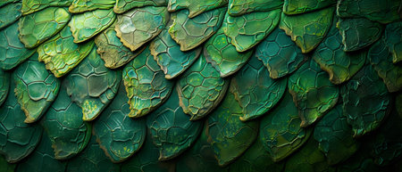 A mesmerizing close-up of vibrant, overlapping green scales, shimmering with an otherworldly, iridescent light.