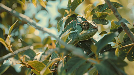 a chameleon blending in with tropical green foliage, created with generative ai