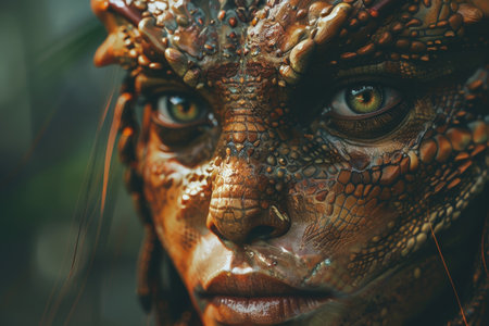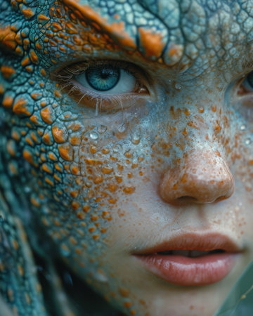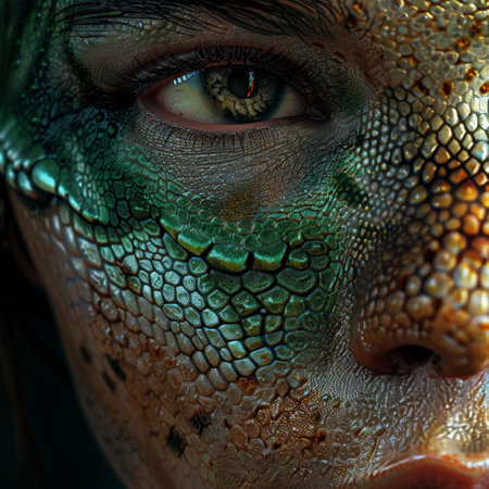 Close-up of a human face with reptilian skin texture