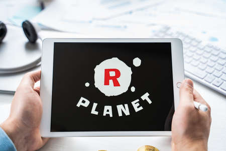 Russia Moscow 05.05.2021.Man holding tablet with logo of gaming platform R Planet. Crypto coins, tokens mining online game. NFT staking system. Cryptocurrency stock exchange. Play, earn digital money.