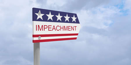 USA Politics Concept: Impeachment Direction Sign With US Flag, 3d illustration against cloudy sky