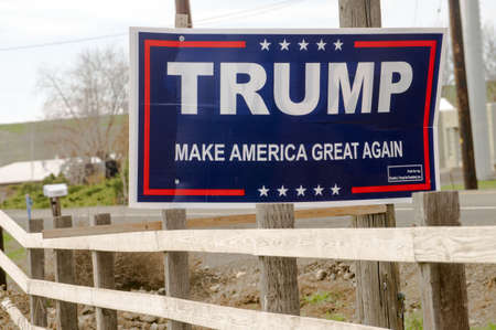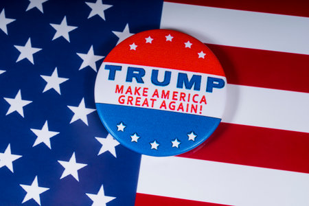 London, UK - November 20th 2018: Trump - Make America Great Again! pin badge, pictured over the flag of the United States of America.
