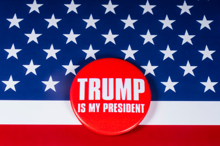 London, UK - November 20th 2018: Trump Is My President pin badge, pictured over the flag of the United States of America.