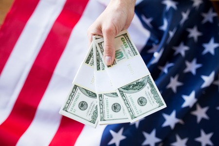 finances, corruption, investment and economics concept - close up of hand with dollar cash money over american flag