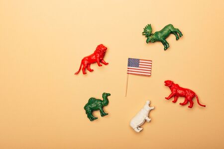 Top view of toy animals with american flag on yellow background, animal welfare concept