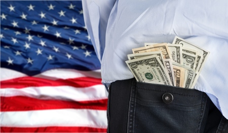 Businessman holding stack of dollar bills in front of blurred american flag background