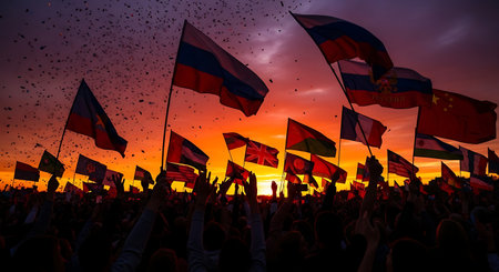 People gather to wave red flags at a rally under a vibrant sunset and city skyline backdrop.