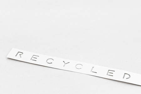 Die cut label of paper with text Recycled. Recycled gray paper background. Copy space
