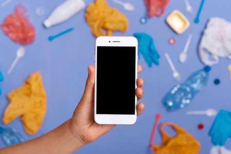 Indoor shot of unknown person hand holding mobile phone with empty display with advertising area, copy space for promotion, against blue wall with plastic waste around.