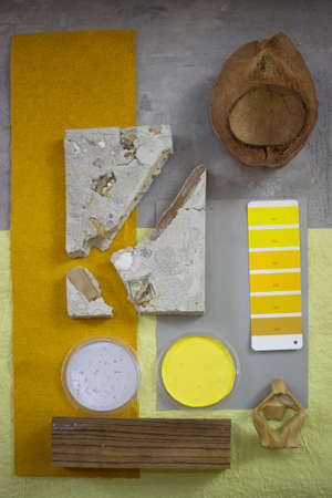 Choosing cabinet panel and countertop material with color scheme. Above view