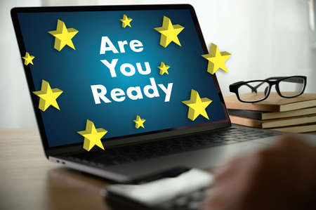 ARE YOU READY? Businessman work hard desktop with laptop, tablet READY