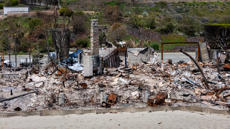 An aerial view shows the devastation in eastern Malibu, with charred landscapes and smoke rising from the wildfires that forced 20,000 evacuations and burned 3,000 acres.