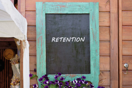 Corporate law, contracts, compliance concept. Copy space. RETENTION written on Charming wooden wall with a turquoise-framed chalkboard.