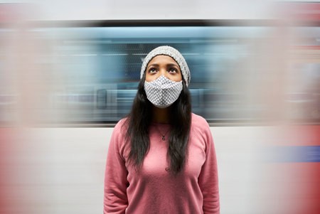 Portrait of a young woman with a mask in front of the camera looking up on the subway platform. The movement of the subway caravan in the background.