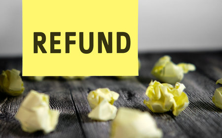 Refund - text on yellow note sheets on a dark wooden background with crumpled sheets