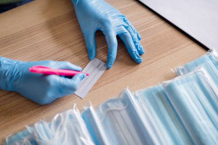 Cropped photo of busy hands latex gloves trend business organizing packing face flu medical masks global spreading write order check address prepare sets delivery home office indoors