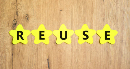 Reuse symbol. Concept word Reuse on beautiful yellow paper stars. Beautiful wooden table wooden background. Business lifestyle ecological reuse concept. Copy space.