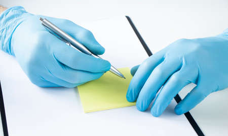 Close up of doctor's hand in gloves with notepad and marker on, standing in hospital, doctor writes recommendations