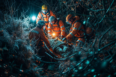 Medical team in bright uniforms is assisting injured person during rescue operation, showcasing teamwork and urgency in critical situation.