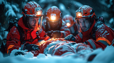 A group of rescuers saving lives in winter