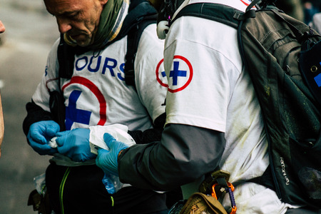 Paris France May 04, 2019 View of French street medic helping a protester injured by the riot squad of the French National Police in the street during protests of the Yellow jackets against the policy of President Macron in Paris on saturday afternoon