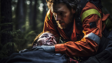 Paramedic caring for hiker in forest highlighting outdoor medical challenges