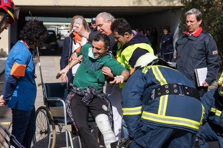 Thessaloniki, Greece - Feb 16, 2018: Salvation crews evacuate patients and injured in hospital AXEPA during exercise for earthquake