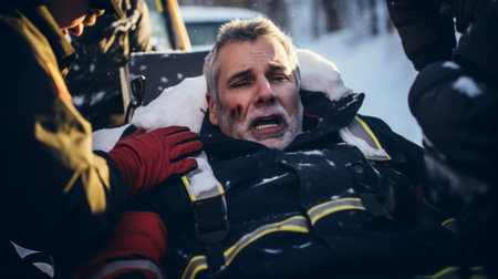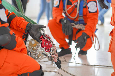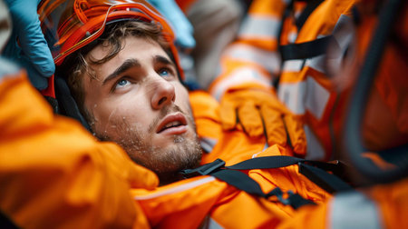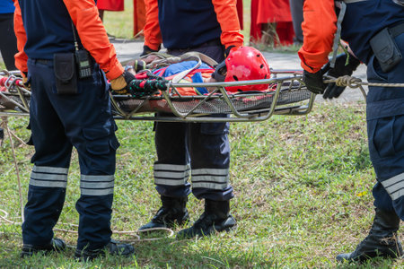 First responders stabilize and immobilize a victim during a rescue in a critical situation