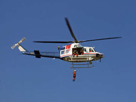 Trieste, Italy - September 27, 2009: Italian police helicopter with divers anchored to the rope, for the transport of men overboard.