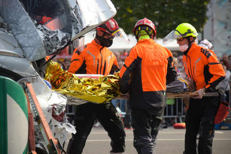 Bad Wiessee - Germany, May 26: public car accident exercise of the volunteer fire department and the Bavarian Red Cross in Bad Wiessee on May 26, 2019