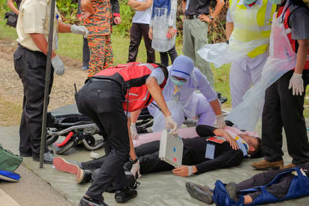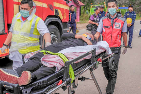Muadzam Shah, Pahang - October 18th, 2018 :Rescuers are helping the wounded on a stretcher to an ambulance during road accidents in Inter Agency Disaster Training Program 2018 .