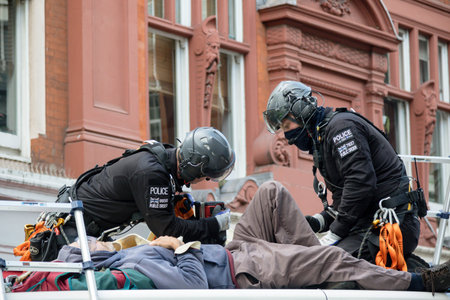 London, United Kingdom, 21st August 2021:- Specialist police officers work to remove an Extinction Rebellion protester from a van’s roof in central London
