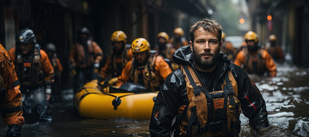 Rubber boat rescue team assisting people stranded on the roof of a flooded building amidst a severe storm and heavy rain