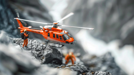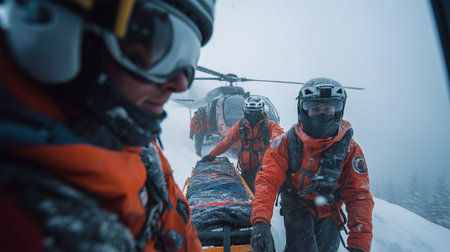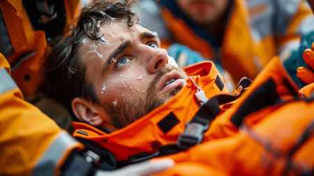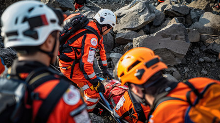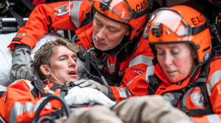 Medical team in bright uniforms is assisting injured person during rescue operation, showcasing teamwork and urgency in critical situation.
