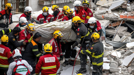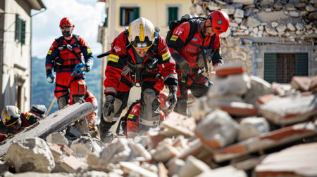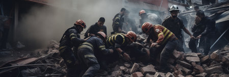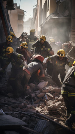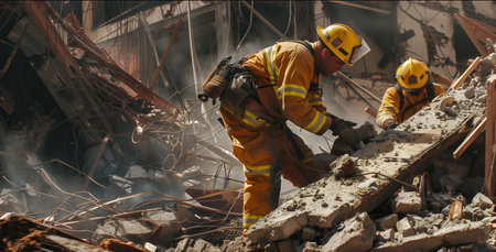 Firefighters Conducting Rescue Operations in a Collapsed Building After a Disaster at Midday