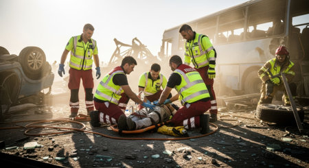 In this image, a group of rescue workers in high-visibility vests and helmets are attending to an injured person at the scene of a crash. The scene appears to be chaotic, with debris and damaged vehicles visible in the background. The rescue team is using a stretcher to carefully transport the injured individual, demonstrating their commitment to safety and care. The image highlights the critical role of emergency responders in providing immediate aid and ensuring the safety of those affected by accidents.