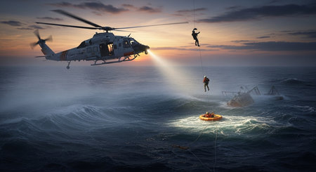 Maritime rescue teams are on duty using helicopters to rescue victims
