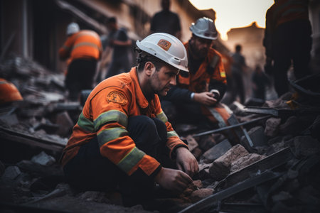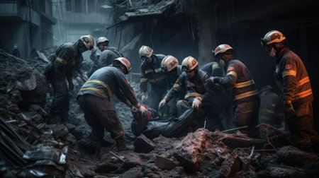 A group of rescuers works on the ruins of buildings after an earthquake or bombing. Search and rescue work. Rescuers show incredible strength and determination as they navigate through the debris.