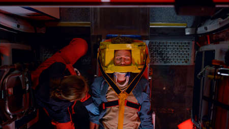 Mixed race ambulance doctors proving medical help to patient after car accident on street. Overhead EMS paramedics transferring man on stretchers in emergency car. Medical team working at night