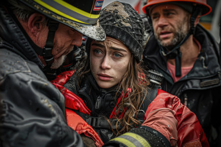 A group of female firefighters debriefing after a challenging rescue mission, their camaraderie and solidarity evident as they reflect on their experiences and support one another in processing the emotional toll of their work.
