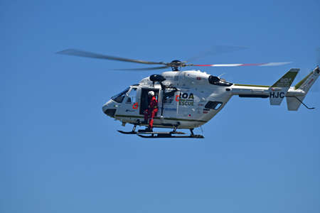 GREYMOUTH, NEW ZEALAND, JANUARY 15, 2021: A rescue helicopter and crew practice rescue operations at the Greymouth airport