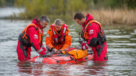 Emergency responders assist an injured individual wearing an orange survival suit, providing care