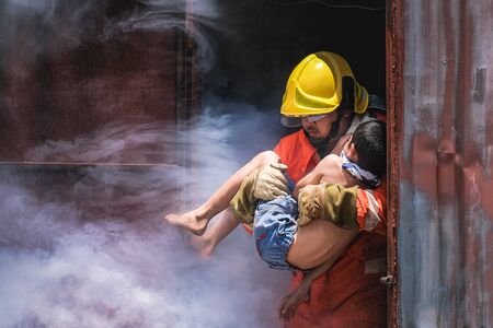 Firefighter holding child boy to save him in fire and smoke,Firemen rescue the boys from fire