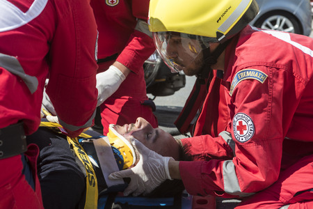 Thessaloniki , Greece - April 9, 2017: First aid, victim liberation in an car accident and helmet removal demonstration by the Hellenic Red Cross rescue team