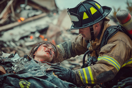 In the aftermath of a devastating disaster, a firefighter tends to an injured individual.