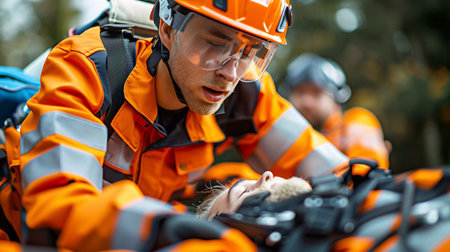 paramedic medical emergency doctor team working in action help first aid save people life at accident site outdoors