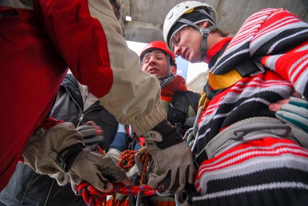 ZHELEZNODOROZHNIY, RUSSIA - March 9, 2008 - Rope jumping event held at the abandoned building construction site. Sports enthusiast groups organize such events for adrenaline lovers from all over Moscow district