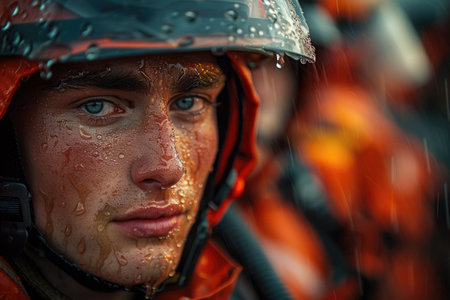 Intensity shines in the eyes of a firefighter, focused and unwavering, as rain falls during a critical operation, capturing the essence of duty under pressure. A.I.