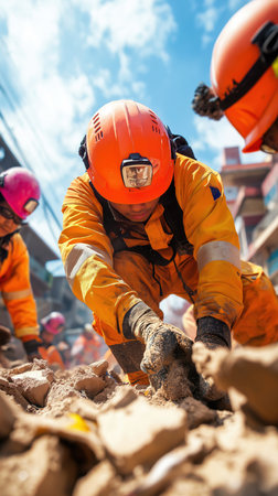 Firefighters searching through rubble and debris for survivors after a devastating building collapse, showing teamwork and courage in the face of danger
