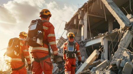 Rescue team in orange uniforms navigates through debris of collapsed building after disaster
